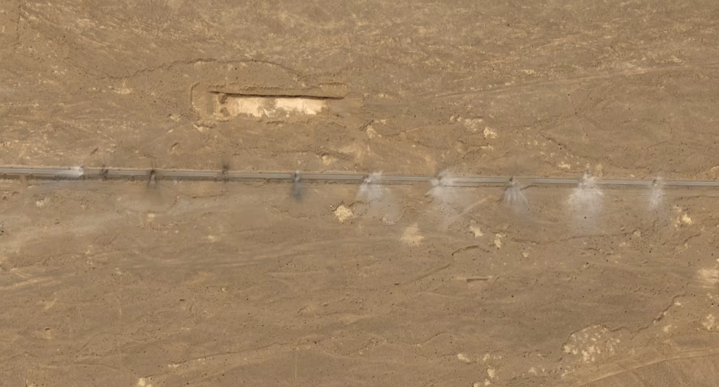 As crateras, que surgem uma após a outra ao longo da estrada, tinham cerca de 9 metros de largura — tamanho suficiente para destruir a largura das vias, que pareciam ter sido alvejadas com precisão deliberada.